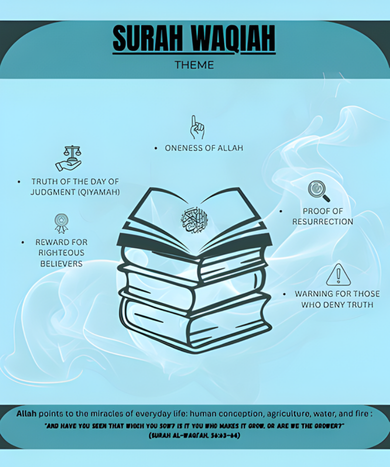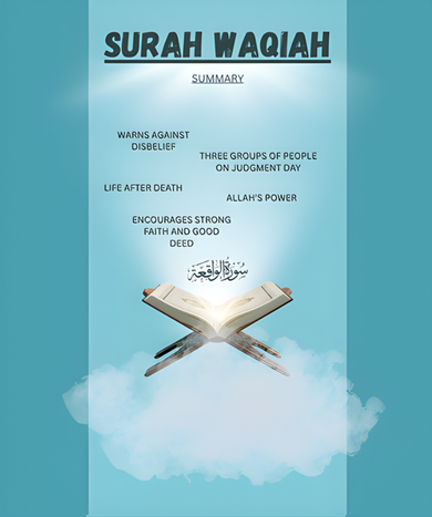 Surah Al-Waqiah is mainly about the Day of Judgment and the reality of the Inevitable Event. It describes how people will be divided into three groups, explains the rewards of the righteous, and warns those who deny the truth. The Surah also highlights signs of Allah’s power, such as creation, provision, and resurrection. Its purpose is to strengthen faith and remind believers of the Hereafter.